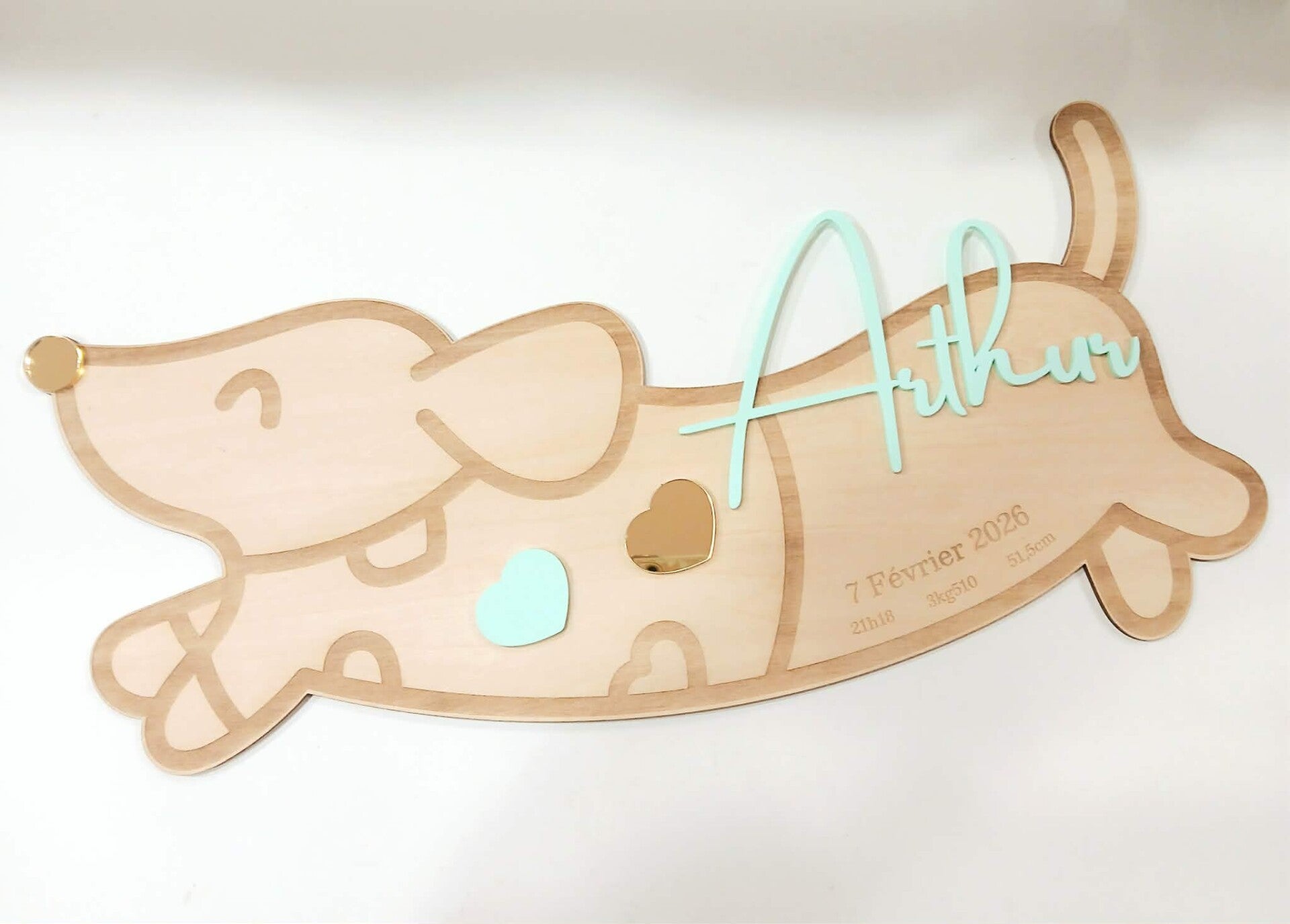 Souvenir de Naissance Personnalisé Apportez une touche de douceur et d'originalité à la chambre de votre enfant avec notre adorable Teckel en bois. Plus qu'une simple décoration murale, cette pièce unique célèbre l'arrivée de votre nouveau-né avec style et tendresse. Fabriqué en bois naturel clair, ce teckel s'intègre parfaitement dans toutes les décorations de chambre : du style scandinave au bohème, en passant par le moderne.